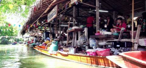 Taling Chan is the floating market closer to Bangkok downtown, nevertheless still rarely visited by tourists and therefore more authentic of the most celebrated and crowded Damnoen Saduak. Located just 12 km west of Rattanakosin Island, the charming floating market takes place along the canal Khlong Chak Phra in homonymous khwaeng (sub-district) of Khet Taling Chan, one of 15 districts in the Thonburi side of capital. This weekend market looks like any other fresh food market in Thailand, with produce vendors from nearby farms are busy to sell all kinds of fresh produce. At the entrance to the market, vendors sell a huge variety of plants and outdoor decorations, but beyond is the real market with stalls and wooden boats where are exposed all kinds of merchandise, such as sweets, fresh fruits and dried fish, but also clothing, handicrafts, wooden items and souvenirs. You can even get a ride on long-tail boat around the nearby klongs for around 100 baht, or a foot massage under the trees for only 200 baht. Nevertheless, like the two other markets close to Bangkok, the definition of floating market is a bit misleading; in fact, most of market takes place on the land along the banks not into the canal, so riverside market is the more correct definition for Taling Chan. Khlong Chak Phra is a very narrow canal and only few boats are parked all along the banks, consequently most of vendors show their wares in stalls on wooden walkways with makeshift roofs, also the food is cooked on the boats but is then served to customers who sit on the wooden floor all along the waterway. The wooden boats moored offer huge prawns cooked on small barbecues, fresh grilled fish, blue crabs, squid, salt crusted sea bass, quail eggs, beef and pork snacks on sticks, some others preparing Som Tam, the famous Thai spicy salad. Near the railway bridge, if you don't want to eat on the floor, there are some restaurants with small plastic tables and low chairs. The small restaurants usually have an illustrated menu which includes all the typical Thai dishes. Eating seafood along the river is a great weekend attraction for locals, a fun experience that you should try at least once. Taling Chan Floating Market is open on Saturday and Sunday from 7.00 am to 5.00 pm.