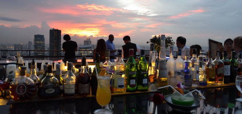 Moon Bar is the exclusive lounge bar extending on the 61st floor of Banyan Tree Hotel in Bangkok. Located on South Sathon Road, in the city's central business district, the prestigious hotel is characterized by a narrow and slender shape. The entire rooftop area of Banyan Tree is occupied by Moon Bar and Vertigo, a renowned international restaurant. Moon Bar offers the opportunities to enjoy pre and post-dinner cocktails atop of roof terrace overlooking the glittering cityscape of Bangkok. Favorite cocktails include the classic Vertigo Sunset, a melody of pineapple, cranberry and lime juices blended with just the right amount of Malibu. From the hotel lobby, an elevator takes you quickly to the 60th floor where there is the famous Chinese restaurant Bai Yun, with a flight of steps leads to the terrace above, which vaguely resembles a spaceship. More