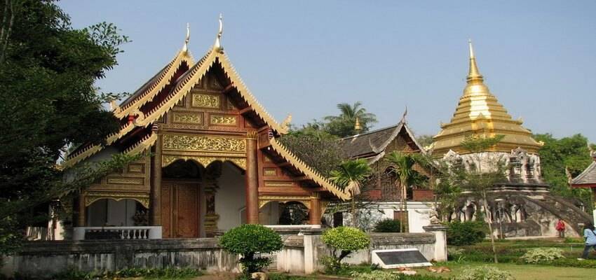 Wat Chiang Man is the oldest temple in Chiang Mai. The temple was built in 1296 by King Mengrai, the first ruler of Lanna Kingdom, who used it as its residence when he oversaw the construction of the new capital; now it is inhabited only by monks. Located at north-east corner of the old walled city, Wat Chiang Man is famous for its Lanna-style Chang Lom Chedi, better known as Elephant Chedi, which is the oldest construction within the temple complex. The square base supports a second level which has a row of 15 elephant-shaped buttresses in real size that seem to carry the upper levels of the building on their backs. The gilded upper chedi contains a bell shaped relic chamber directly underneath the pinnacle. The main Lanna-style ordination hall of temple was renovated in the 1920s by the monk Khru Ba Srivichai. The Viharn houses a large mondop structure with an altar surrounded by Buddha statues, including a standing Buddha with an alms bowl dating the year 1465. The façade of building features gilded carvings of Kirtimukha in between flower and plant motives. The second Viharn, smaller and more recent, is characterized by huge decorated columns in teakwood that support the roof at the top. Inside the ordination hall, a small room on the right houses two important and venerated statues of the Buddha, the Phra Sila and the Phra Sae Tang Khamani, which, due to their protective powers, are regarded as the Palladium statues of Chiang Mai: The Phra Sila, the larger of the two, is a stone stele depicting a standing Buddha whilst taming the elephant 'Nalagiri' in bas-relief. According to some historians, the statue was imported from India two about thousands years ago, however, others believe the statue was imported from Sri Lanka during the 8th or 10th century CE depending on the source. Phra Sae Tang Khamani, also known as Phra Khao Kaew or Crystal Buddha, was carved from a clear quartz crystal and has a height of only ten centimeters. The artifact has at least 1,800 years old and was allegedly carved for King Ramraj of Lopburi and brought to the Hariphunchai Kingdom, the present day Lamphun, by Queen Jamadevi in 662 CE, and then transferred to Chiang Mai by King Mangrai in 1296, after he had conquered Lamphun. The gold covered wooden base and golden canopy are later additions donated by King Inthawichayanon of Chiang Mai in 1874. Together they contain more than 6 kg of gold.