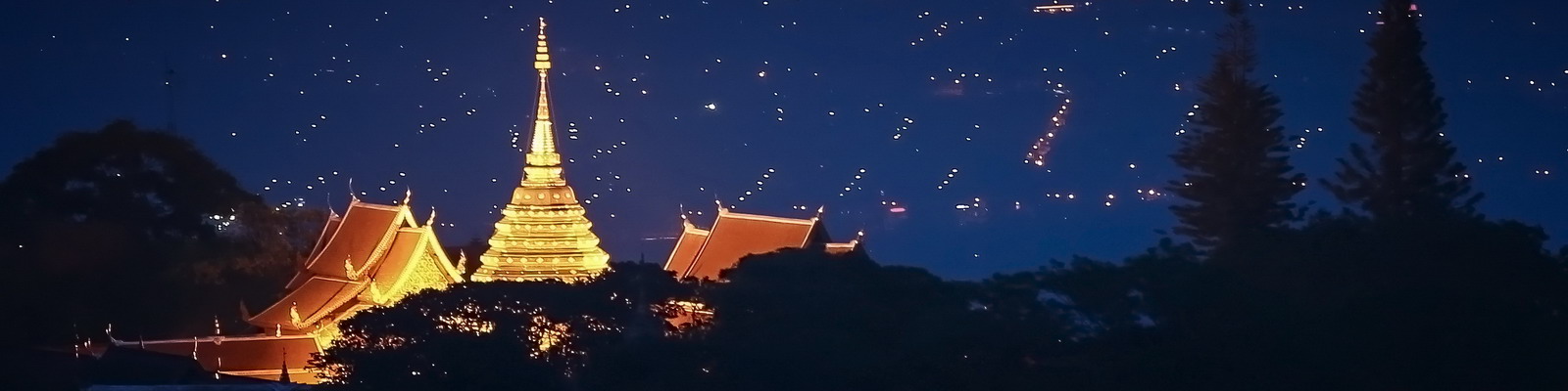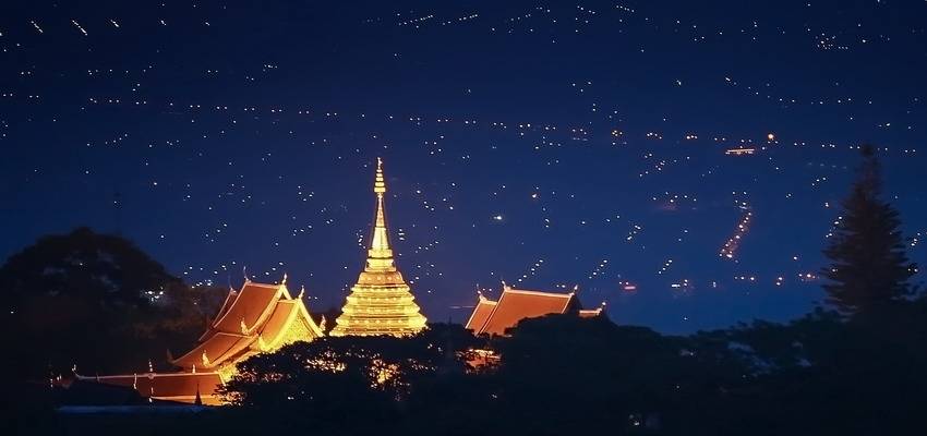 Overlooking Chiang Mai from a top of a hill forming the Doi Suthep mountain, around 1,060 meters above sea level, Wat Phra That Doi Suthep is the city's most sacred temple and one of the most important temples of Theravada Buddhism in whole Thailand. Often referred simply to as "Doi Suthep Temple", it is located about 7 km west of the city center and accessible via a 15-kilometer winding mountain road since 1935, before it was built the only way to get there was to follow the trails along the mountain. At the end of the road you will be in a large car park filled with plenty of restaurants and stalls selling any kinds of items and food, the temple complex is up the side of the mountain beside the car park. Thanks to a lift you can easy climb up the hill, but a devout Buddhist prefers to walk up the 309 steps of the intricately carved mythical Naga Serpent Staircase. On reaching the top, once inside the temple area, visitors must be appropriately dressed and must remove footwear. The beautiful copper plated chedi cover most of holy area of temple. Within the site are pagodas, statues, bells, a museum, and shrines. The walls around the spiral chedi form a mini enclave and are richly decorated with historical murals that draw from both Buddhism and Hinduism. There is also a model of the Emerald Buddha and a statue of the Hindu God Ganesh. There is a wide walkway around the main temple which leads you to a large viewing terrace with stunning views over Chiang Mai. The Doi Suthep Vipassana Meditation Center at Wat Phra That Doi Suthep hosts several religious outreach programs and meditation courses. Built as a Buddhist monastery in the late 13th century it is still a working monastery today. The exact date of the founding of the temple remains a legend and there are a couple of different versions. According to the most accepted version, it is assumed that the temple was founded in 1383 when the first stupa was built to house a bone found, about fifteen years before, in Ban Pang Cha by a monk named Sumanathera. Many claim it was Gautama Buddha's shoulder bone. The relic displayed magical powers: it glowed, it was able to vanish, it could move and replicate itself. Sumanathera took the relic to King Dhammaraja, who ruled Sukhothai at that time. However, the relic displayed no abnormal characteristics, and the king, doubtful of the relic's authenticity, told Sumanathera to keep it. King Nu Naone of Lan Na heard of the relic and bade the monk to bring it to him. In 1368, Sumanathera took the relic to what is now Lamphun, in northern Thailand. Once there, the relic broke into two pieces. The smaller piece was enshrined at a temple in Suandok. The other piece was placed by the king on the back of a white elephant which was released into the jungle. The elephant is said to have climbed up Doi Suthep, then stopped and trumpeted three times it dropped dead. This was interpreted as an omen. King Nu Naone immediately ordered the construction of a stupa at the site.
