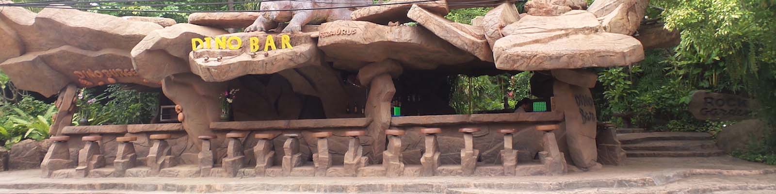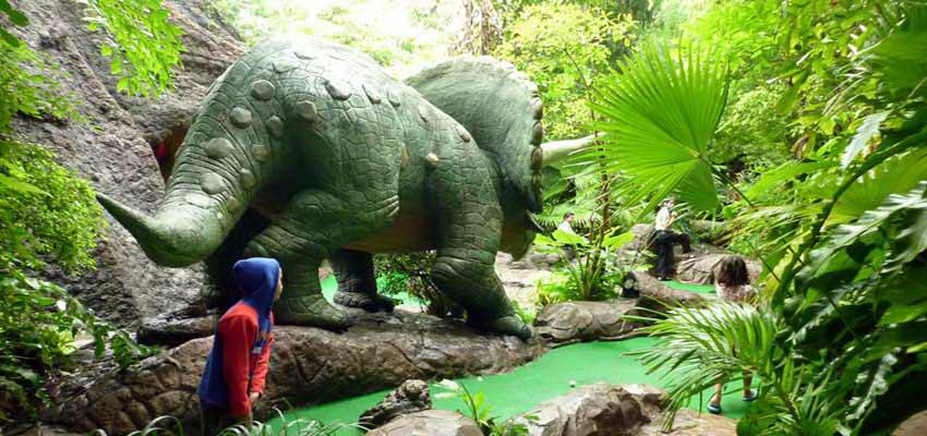 The Dino Park is a mini golf park with restaurant located between the beaches of Karon and Kata. The theme of 18-hole course is inspired to dinosaurs, with large statues of these prehistoric animals; also the restaurant is themed with characters that reproduce the famous Flintstones. Very popular among adults and children the mini golf, is an ideal destination especially in the evening when temperatures drop, and when the play of light of volcano that erupts every thirty minutes gives the park a charming atmosphere. The miniature golf course is challenging enough, but still doable by all even to children. You will be a switch from a primordial swamp, the crossing of a lava cave, or to do a hole in the mouth of a roaring Tyrannosaurus Rex. There is a waterfall 12 meters high to overcome, one other hole consists of a passage under a volcano which erupts lava and fog accompanied by impressive sound effects. Before or after the course you can enjoy a refreshing drink or eat a hamburger at the Flintstones Restaurant served by Fred and Wilma.