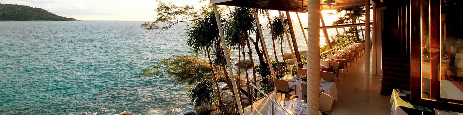 Nestled on the headland between Kata Yai and Kata Noi, the Mom Tri's Kitchen at Villa Royale is a world famous restaurant that offers fine dining in an amazing setting. This gourmet restaurant extends in two open dinning rooms and one air-conditioned enclosed lounge area. The lush garden and terrace boast stunning views of the white sand beach of Kata Noi and Andaman Sea. The two talented Chefs, Chef Darren and Chef Sura, offer a mix of Thai fusion dishes, Royal Thai and International cuisine using only the finest ingredients. The Wine Spectator award winning wine cellar houses over 750 labels. The exclusive private enclosed dinning room is complimented with its own wine cellar and special menu, and receives the undivided attention of one server/sommelier.
