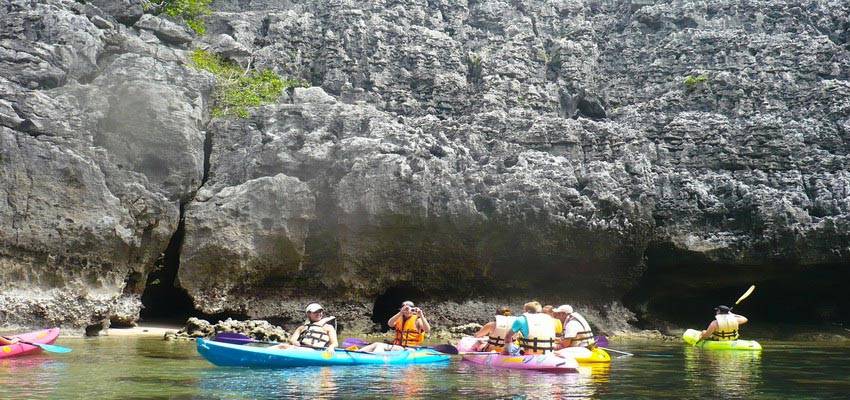 Mu Ko Ang Thong is a marine park with a total area of 102 km², of which only 18 km² are terrestrial. The park consists of 42 beautiful islands that extend in a north-south between the mainland and Koh Samui. Ang Thong means golden bowl, while Mu Ko simply means the group of islands. Mu Ko Ang Thong is 28 kilometers from Koh Samui and 32 kilometres from Koh Pha Ngan. Ang Thong has earned worldwide fame since it was mentioned in the novel 'The Beach', as the secret island discovered by backpackers protagonists of the book. Following the movie with Leonardo Di Caprio was filmed on Phi Phi Islands, but Ang Thong has remained in the minds of many as a place of escape paradise. The islands of the park are covered by limestone mountains, with lush forests and waterfalls, white sand beaches alternated by areas of fertile mangroves. There is an abundant bird life as well as monkeys, lizards, pythons and wild pigs; its crystal waters are rich of marine life. The best time to visit the park is from March to October, when the sea is calmer, during the monsoon, from November to January, the park is sometimes closed. For those who wish to stay overnight, there are some spartan bungalows and tents at the headquarters of the Park in Koh Wua Talap, where there is also a restaurant. Koh Wua Talap, as well as being the headquarters of the park, is one of the most beautiful islands of the archipelago. In its Kha Bay has a beautiful unspoiled white sand beach with crystal clear water, it is a real tropical paradise. From the bay a path leads up to the hill at a height of 400 meters, where is the View Point Hiking Trail; from this panoramic point you can see all the park's islands. On the island there are the caves Bua Bok, unique in their geological formation, where you can admire beautiful stalagmites and stalactites. Another beautiful island of park is Koh Mae, which has a lake in its interior. The Thale Nai, also know as Emerald Lake, is connected to the sea by a natural tunnel. In the face of Koh Mae is the smallest Koh Sam Sao. The island is well known for its white sandy beaches and the beautiful coral reef, suitable for swimming and snorkelling. Koh Paluay is the only inhabited island in the archipelago. Here lives a small community of Moken Sea Gypsies, known locally as Chao Ley, which keeps unchanged the lifestyle based on the resources of the sea.