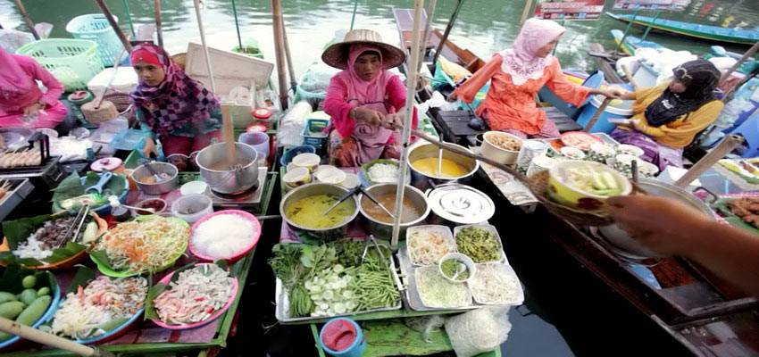 Khlong Hae Floating Market in Hat Yai is the first floating market opened in the extreme south of Thailand. The market is held on Fridays, Saturdays, Sundays and public holidays along the banks of a large canal facing the Wat Khlong Hae, a beautiful Buddhist temple situated 4 km north of downtown, right on the way to Songkhla. Opened since August 2008, the floating market is born from an idea of the ex-village headman. Nowadays, the market has been developed in every aspect as more tourists visit here unceasingly. The atmosphere is quite different from the other floating markets in Thailand as the vendors wear hijab because most of local people are Muslims. About a hundred of vendors pack their wares onto small boats and jostle with each other for the attention of buyers alongside the canal. The products for sale are the usual suspects like handicrafts, household items, clothing, t-shirts, souvenirs and of course a lot of street food. This area of the Thailand has a large presence of practicing Muslims consequently the pig is not usually included in the menu offered, and other meats are mostly Halal. Visitors can enjoy the Khanon Mod, fried rice balls rolled in bean paste, or Khao Yam a rice salad in southern style. On small charcoal barbecues, sellers cook large shrimp, squid, fish and chicken satay, while many others sell Kao Phad Talè, Phad Tai and Phad Si-Io. All the food is cooked with traditional recipes of Southern Thailand and it is very cheap. Khlong Hae Floating Market also has a campaign for the environment as the sellers use bamboo tubes, coconut shells and clay pots instead of using plastic bags or foam boxes.